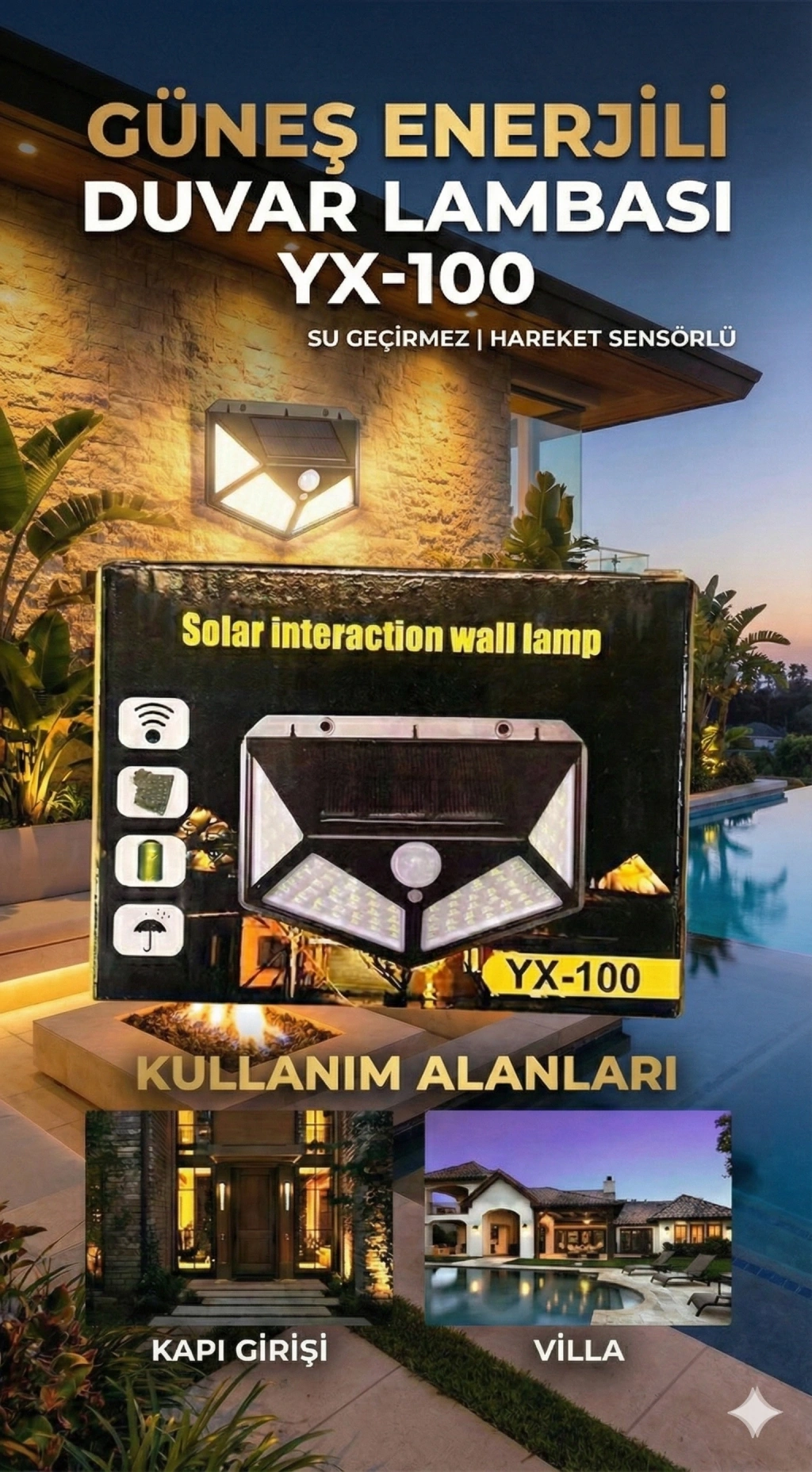 Çeşitli avantajlar:100LEDs güneş su geçirmez dört taraflı insan vücudu indüksiyon duvar lambası kullanımı kolaydır. Gösterge lambası görüntüleme fonksiyonu eklenir. Enerji tasarrufu, çevre koruma, dayanıklı, kullanımı kolaydır. Buna ek olarak, uzun ömürlü, düşük arıza onarım oranı, yüksek radyasyonsuz stabilite, basit kurulum (ürünü açık güneş parlayan duvarda sabitlemek için sadece iki vida), akıllı ışık indüksiyon kontrolü, ayar yok, vb.
