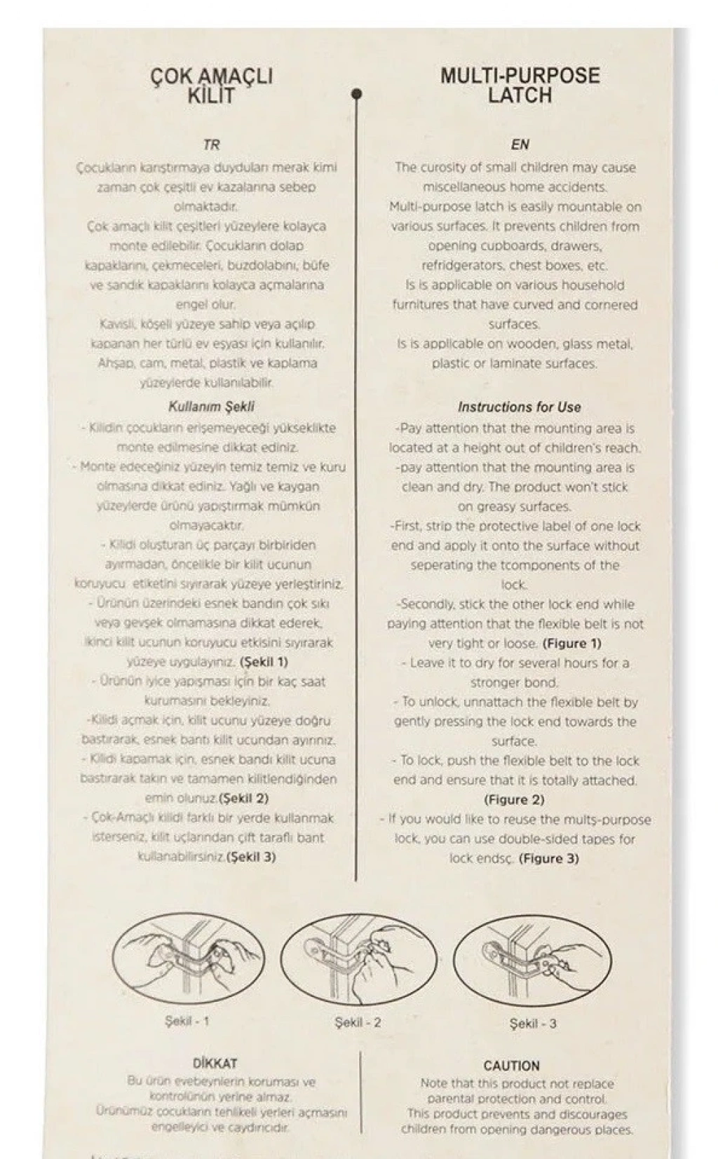 Evdeki dolap, buzdolabı, çamaşır makinesi gibi eşyalara yapıştırarak çocuklarınız için daha güvenli ve kazasız bir ortam sağlayabilmeniz mümkün.