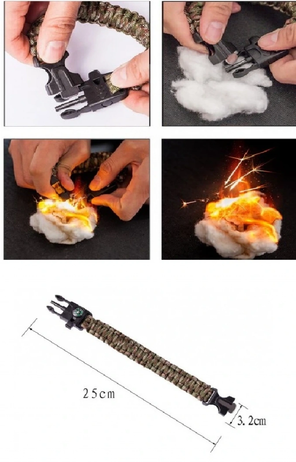 Bileklik hayat kurtarıcı, acil bir durumda kullanılabilen düdük, çakı, çakmaktaşı, pusula ve paraşüt ipi olarak kullanıma uygundur.