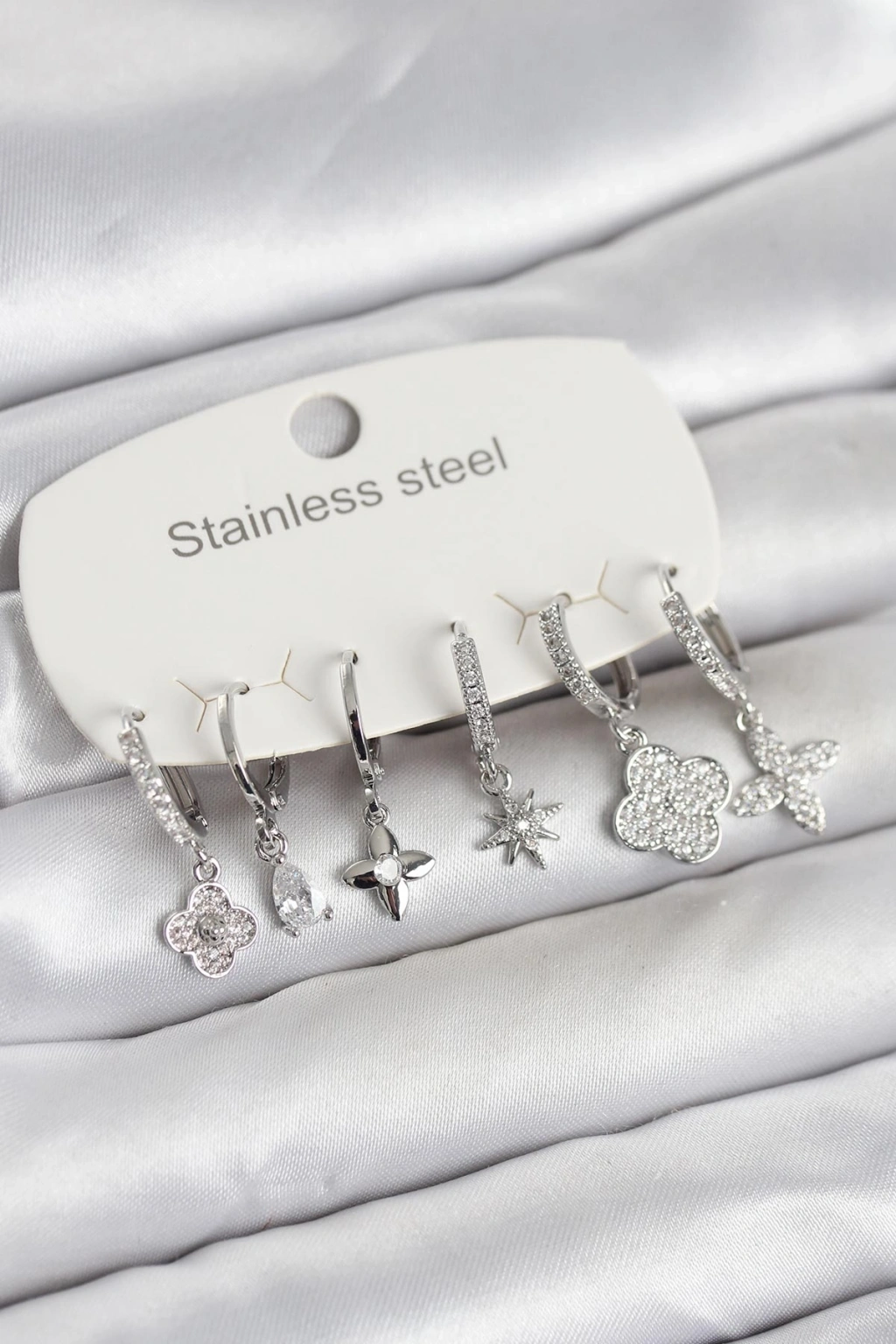 HEYF 316L Çelik Gümüş Renk 6'lı Set Yonca Model Kadın Küpe