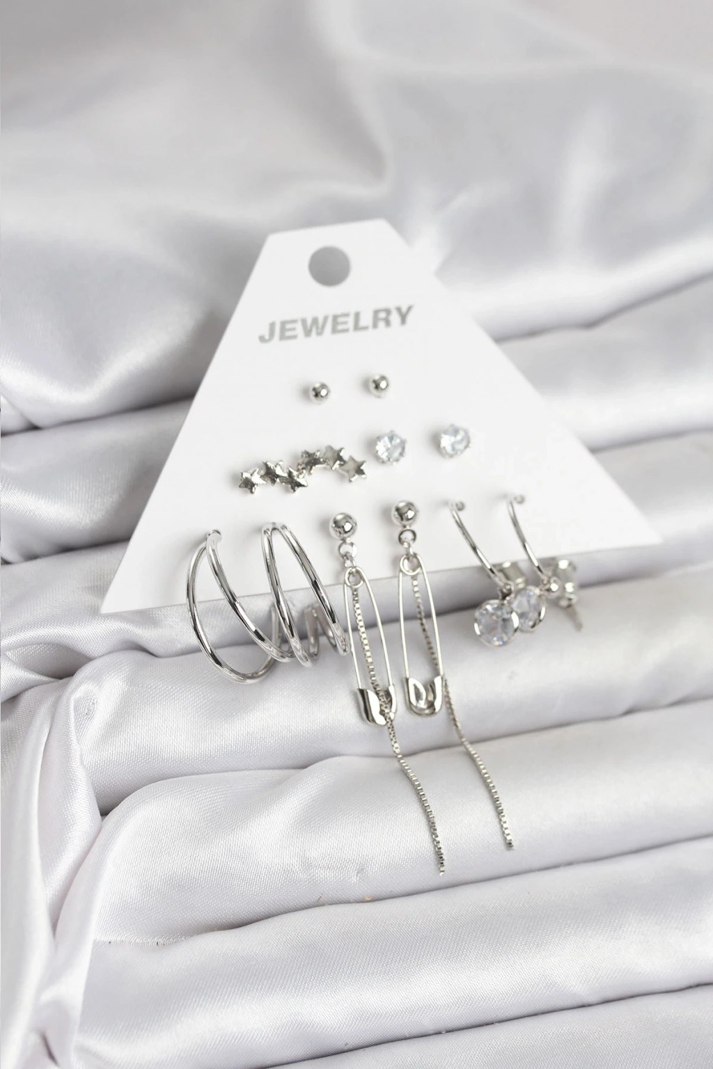 HEYF Gümüş Renk 6'lı Pirinç Küpe Seti