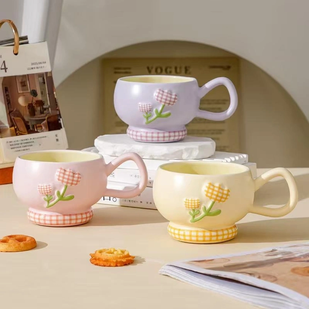 Kabartmalı Motifli Tasarım Çiçekler Seramik Kupa Bardak