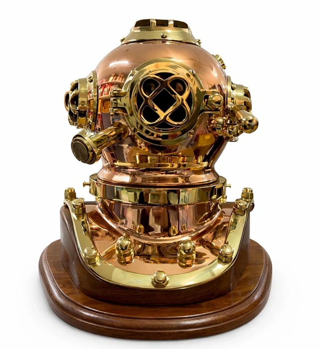 PİRİNÇ DALGIÇ BAŞLIĞI 50x50 CMÜrün ÖzellikleriMekanınıza tarihin en görkemli keşif ruhunu dahil edin! 50x50 cm boyutlarındaki bu devasa Pirinç Dalgıç Başlığı, denizlerin derinliklerindeki gizemi temsil eden en prestijli dekoratif objelerden biridir. Yüksek kaliteli masif pirinç ve bakır aksamların usta bir işçilikle birleştiği bu kask, antika "Mark V" modellerinden ilham alınarak aslına sadık bir replika olarak tasarlanmıştır. Altın sarısı pirincin parıltısı ile bakırın kızıl tonları, ağır ve vakur duruşuyla bulunduğu her ortamın atmosferini anında değiştirir. Masif ahşap tablası üzerine monte edilen bu kask; ızgaralı vizörleri, vidalı kilit mekanizmaları ve hava valfi detaylarıyla büyüleyici bir görsel derinlik sunar. Ofis lobileri, geniş salonlar, lüks kütüphaneler veya marin temalı restoranlar için eşsiz bir odak noktası olan bu dev boy dalgıç kaskı, koleksiyonerler ve deniz tutkunları için sunulabilecek en değerli ve lüks hediye alternatiflerinden biridir.Ürün Teknik ÖzellikleriÖzellikAçıklamaÜrün AdıDev Boy Pirinç Dalgıç Başlığı (Kaskı)Boyutlar50 cm (Yükseklik) x 50 cm (Genişlik)MalzemeYüksek Kaliteli Pirinç, Bakır ve Cam DetaylarTabanVernikli Masif Ahşap TablaTasarımNostaljik Mark V Dalgıç Kaskı ReplikaStilGörkemli, Nostaljik, Marin ve Lüks DekorasyonAğırlıkYüksek Malzeme Kalitesine Sahip Ağır GövdePaket İçeriği1 Adet Masif Ahşap Tablalı Dev Boy Pirinç Dalgıç Başlığı (50x50 cm)