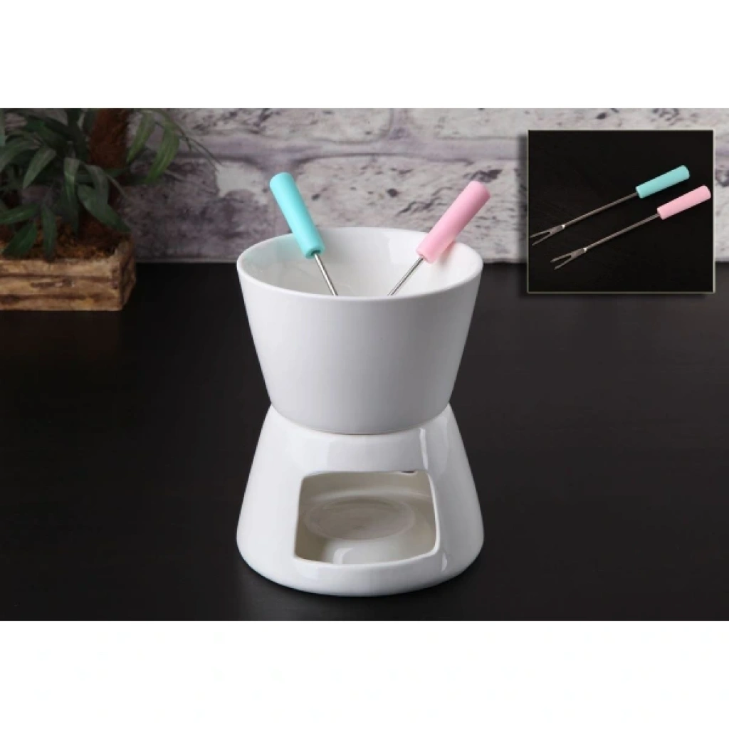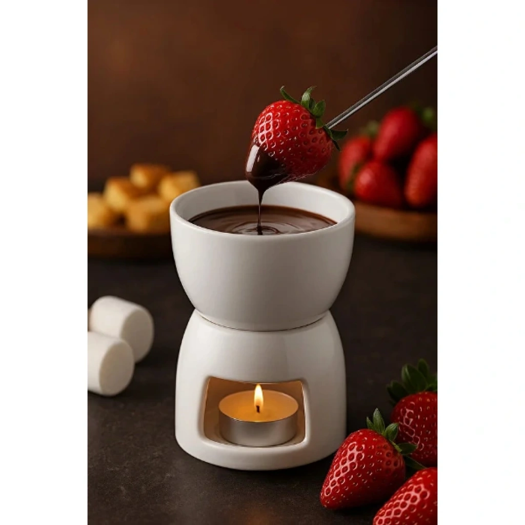 PORSELEN FONDÜ SETİÜrün ÖzellikleriEvde romantik anlar, keyifli akşamlar ve tatlı sunumlar için mükemmel bir tercih olan Porselen Fondü Seti, şık ve minimalist tasarımıyla dikkat çeker. Isıya dayanıklı porselen malzemeden üretilmiş bu set, çikolata, peynir veya karamel gibi lezzetleri eritirken mükemmel ısı dengesini korur.Alt kısmında yer alan mum haznesi, içerideki çikolata veya peyniri ideal sıcaklıkta tutar; böylece fondü keyfi uzun süre devam eder. Renkli saplara sahip iki adet metal çatal, hem pratik hem de estetik bir kullanım sunar. Bu sayede meyvelerinizi, marshmallow’larınızı veya atıştırmalıklarınızı hijyenik ve rahat bir şekilde fondüye batırabilirsiniz.Küçük boyutu sayesinde masa üzerinde fazla yer kaplamaz ve kolayca taşınabilir. Şık görünümüyle davet sofralarınıza zarif bir dokunuş katar, aynı zamanda özel günlerde sevdiklerinize hediye olarak da mükemmel bir seçimdir.Hem pratik hem de dekoratif yapısıyla mutfağınızın en zarif yardımcılarından biri olacak bu fondü seti, tatlı sunumlarına profesyonel bir dokunuş kazandırır.Paket İçeriği1 adet porselen fondü kabı1 adet alt stand2 adet paslanmaz çelik fondü çatalı