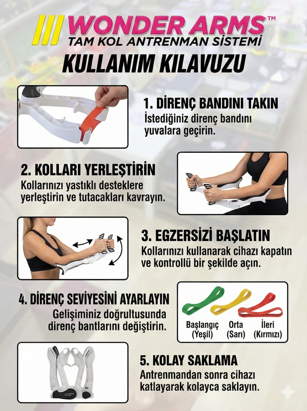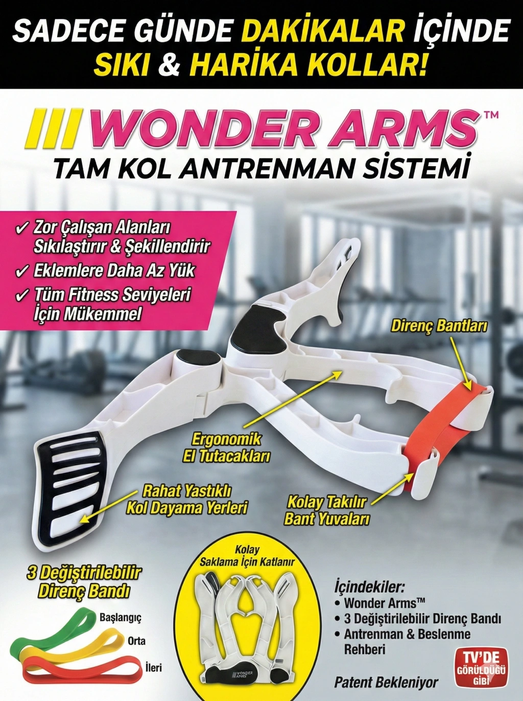 Wonder Arms Kol Egzersiz Aleti Wonder Arms, kollarınızın altındaki bu sorunlu alandan kurtulmanıza yardım eden eğitim cihazıdır.Sırt, biseps, triceps, omuz ve hatta göğsünüzün tek seferde çalışan benzersiz dinamik direniş hareketler ile inanılmaz sonuçlar elde edin.Eklemleri zorlanmadan kalori yakarken kaslarınızın sıkılaşmasını ve sıkılmasını hissedeceksiniz.Tüm fitness seviyeleri için mükemmeldir.Dört farklı kas grubunu hedefler ve üç farklı direnç bandıyla gelir.Wonder Arms Nedir?Wonder Arms, dirençle çalışan ergonomik bir eğitim cihazıdır.Seviyenize (başlangıç, ortalama veya tecrübeli) bağlı olarak direniş bandını seçin ve Wonder Arms'a yerleştirin Cihazı yerleştirdiğiniz yere bağlı olarak omuzlarınızı, pazılarınızı, tricepslerinizi, göğüslerinizi ve sırt kaslarınızı eğitin.Egzersizler eklemleriniz için stresli değildir ve hem oturma hem de ayakta olarak yapılabilir.Wonder Arms bölgeleri hedefler ve onları göstermekten gurur duyacağınız sert, gösterişli, kollara ve omuzlara dönüştürür. |